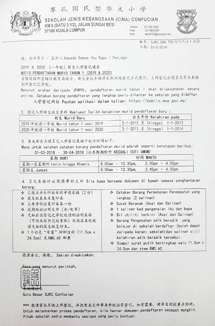 吉隆坡尊孔华小sjkc Confucian Kuala Lumpur 2019 2020 一年级新生报名pendaftaran Murid Tahun 1 Sesi 2019 2020