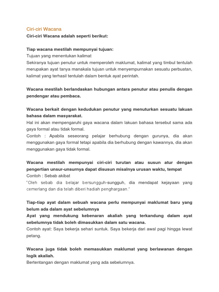Ciri ciri wacana. Wacana lisan memiliki ciri ciri sebagai berikut. Satuan bahasa itu dapat berupa rangkaian kalimat atau ujaran. Sebab akibat oleh sebab dia belajar bersungguh sungguh dia mendapat kejayaan yang cemerlang dan dia telah diberi hadiah penghargaan tiap tiap ayat dalam sebuah wacana perlu mempunyai maklumat baru yang belum ada dalam ayat sebelumnya.