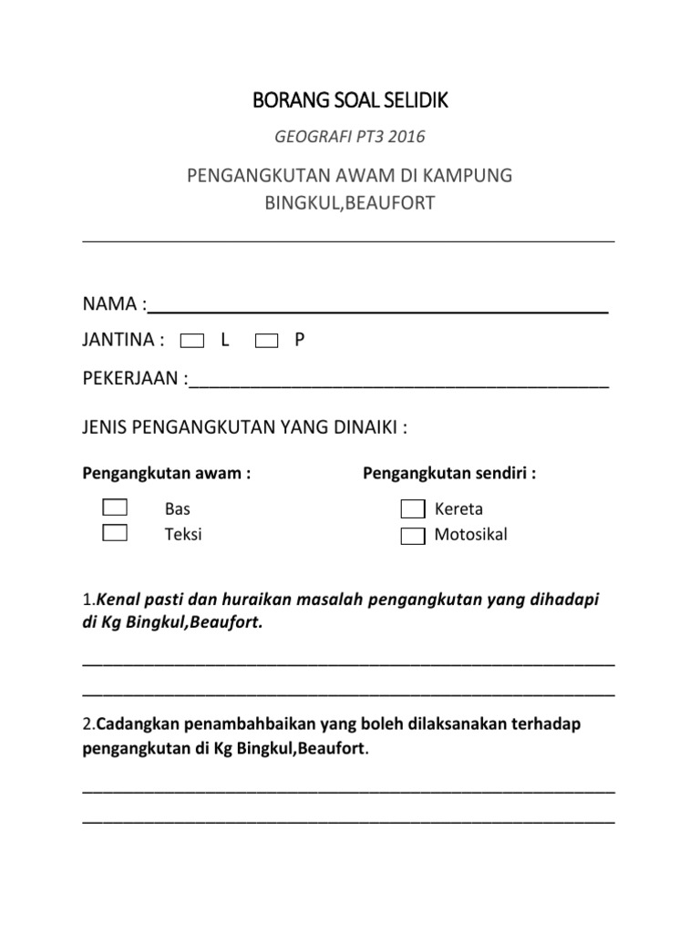 Contoh Soalan Borang Soal Selidik Pengangkutan Awam J Kosong W