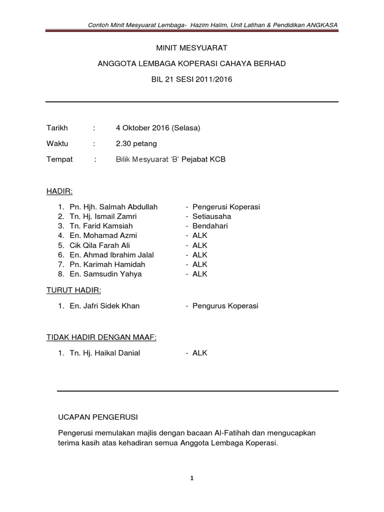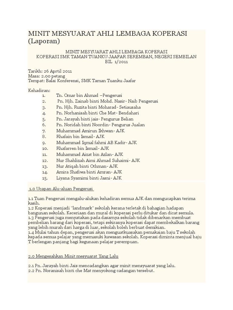 Minit Mesyuarat Ahli Lembaga Koperasi Montly