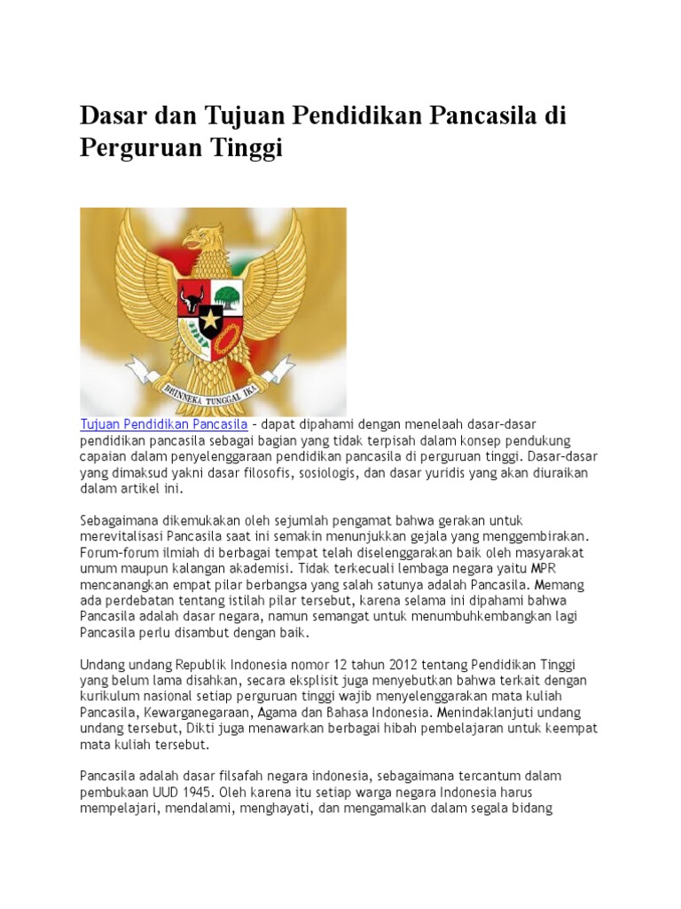 Dasar Dan Tujuan Pendidikan Pancasila Di Perguruan Tinggi