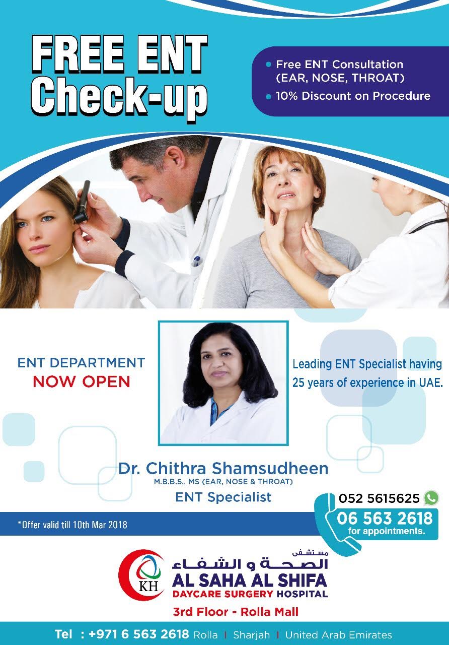 Connect Ae On Twitter Renowned Ent Specialist Dr Chithra Shamsudheen Has Joined Al Saha Al Shifa Hospital Rolla Sharjah Free Check Up Till 10 03 18 Appointments 06 5632618 Ent Ear Nose Throat Specialist Doctor Hospital